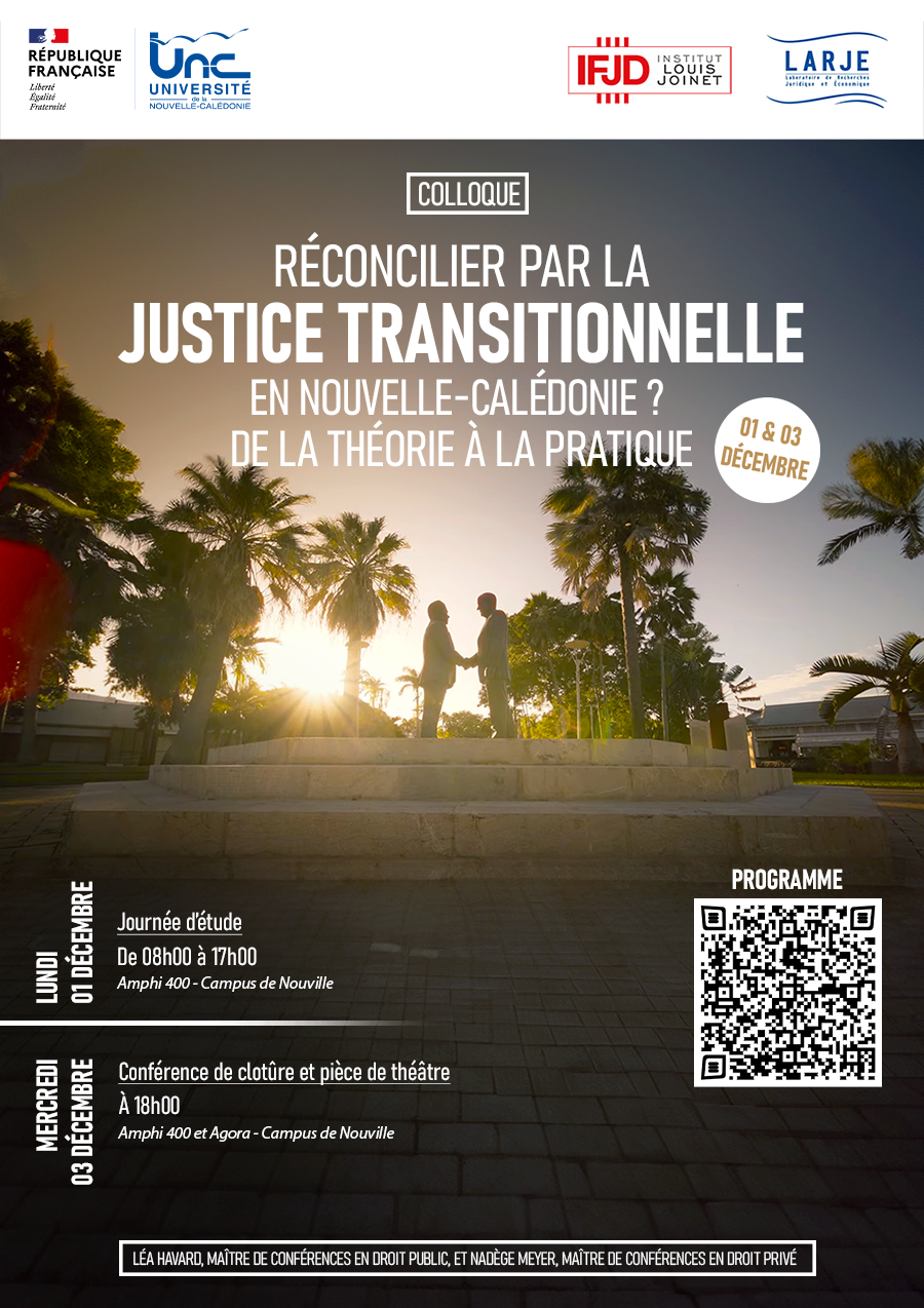 Le Laboratoire de recherches juridique & économique (LARJE-UNC) organise, en partenariat avec l’Institut Louis Joinet (IFJD), un colloque sur le thème « Réconcilier par la justice transitionnelle en Nouvelle-Calédonie ? De la théorie à la pratique », les lundi 21 et mercredi 23 juillet 2025.
