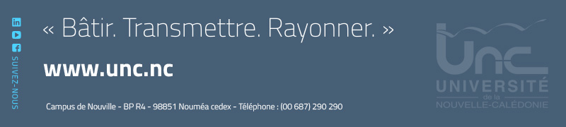 Nous contacter Campus de Nouville - BP R4 - 98851 Nouméa Cedex - Téléphone : (+687) 290 290 © Université de la Nouvelle-Calédonie - Mentions légales