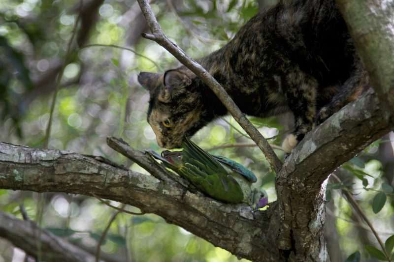 Chat haret (chat domestique retourne a l’etat sauvage) (Felis catus) en milieu forestier predatant un ptilope de Grey (Ptilinopus greyi).