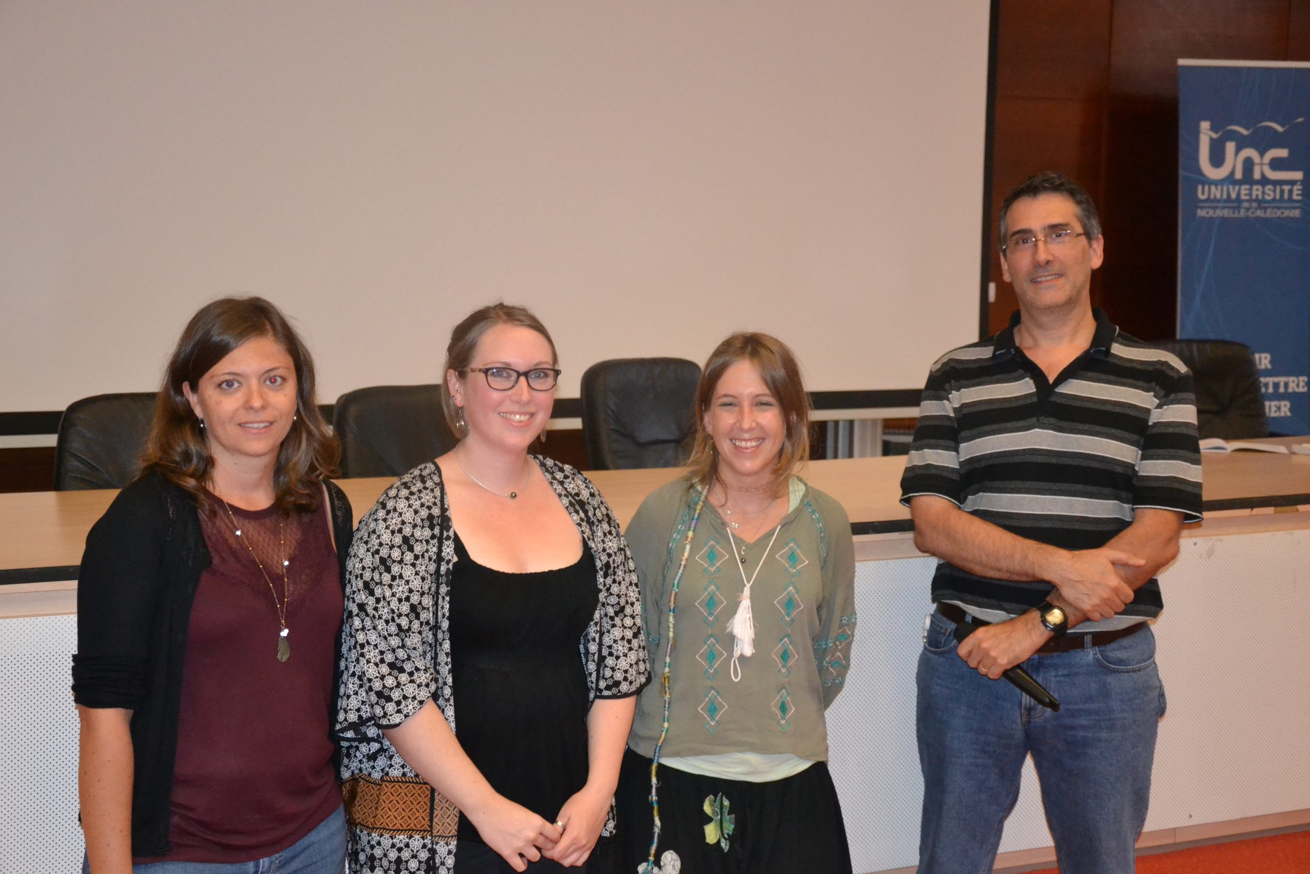 Les lauréats des doctoriales 2017 (de g. à d. : Noémie Coulombier, Élodie Calvez et Lise Leroy) en présence du directeur de l’École doctorale du Pacifique (Yves Letourneur).