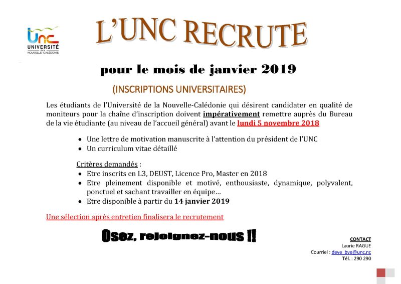 Nous contacter Campus de Nouville - BP R4 - 98851 Nouméa Cedex - Téléphone : (+687) 290 290 © Université de la Nouvelle-Calédonie - Mentions légales
