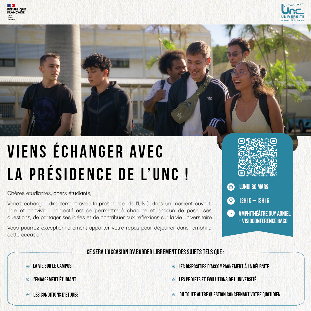 L’Université de la Nouvelle-Calédonie invite ses étudiantes et étudiants à participer à un moment d’échange direct avec la présidence, le lundi 30 mars, de 12h15 à 13h15, en amphithéâtre Guy Agniel.