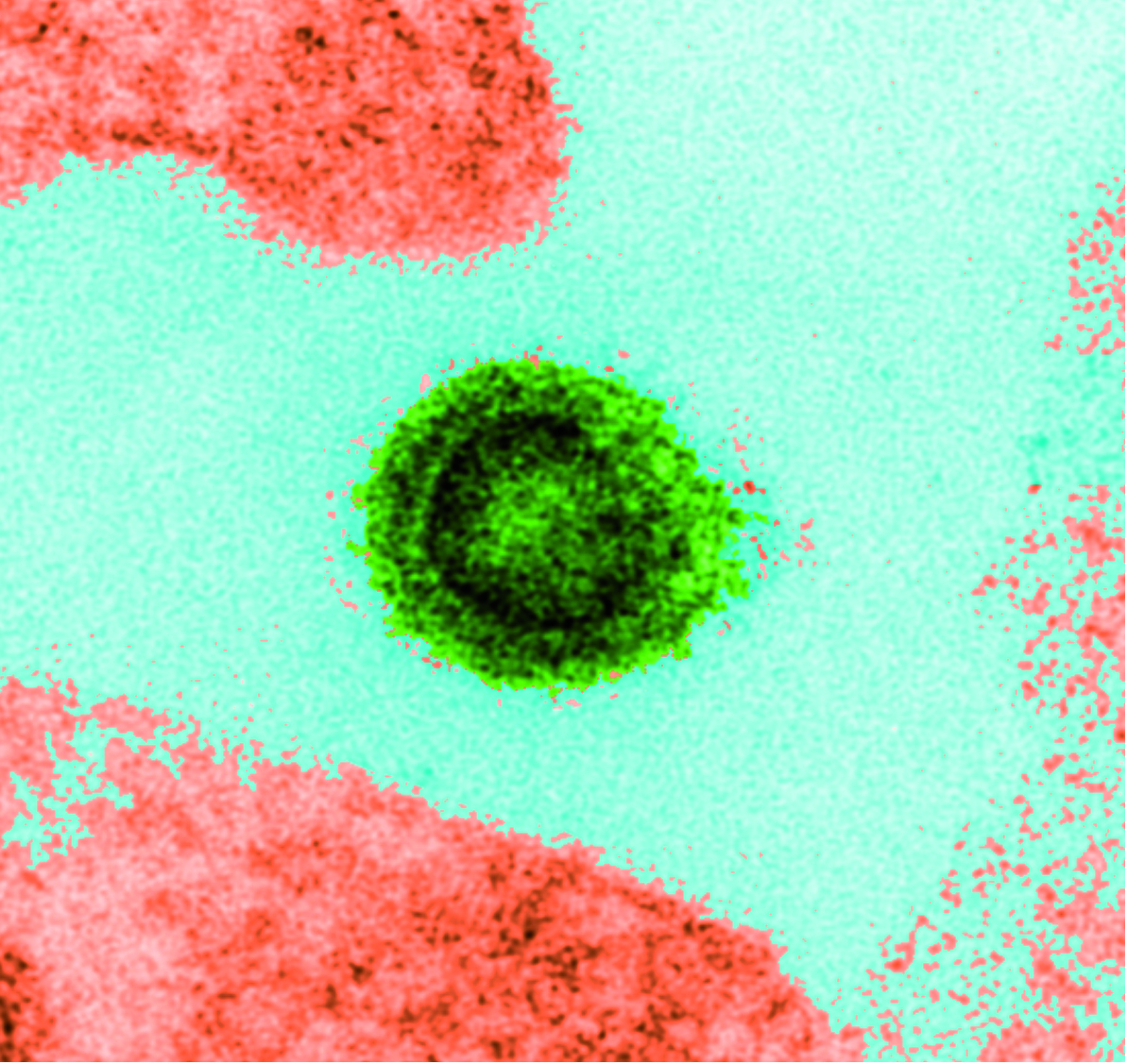 Image colorisée, le virion est en vert.